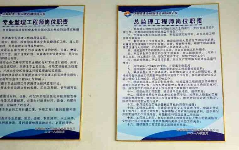 國網(wǎng)安徽太湖項目監(jiān)理部結合公司項目部辦公場所標準化標志標牌,實現(xiàn)崗位職責和管理制度上墻。