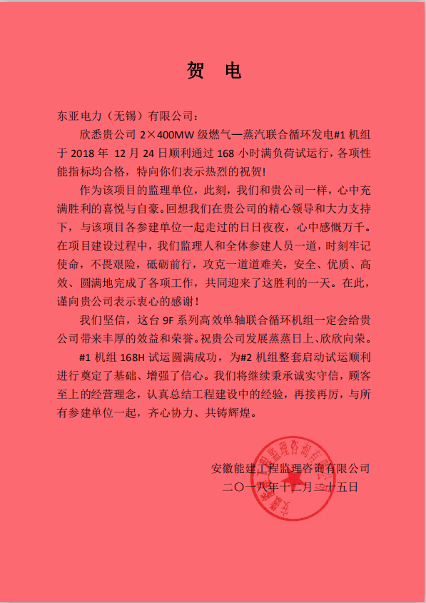 賀電:致東亞電力(無錫)燃機發電項目#1機組168小時試運圓滿結束